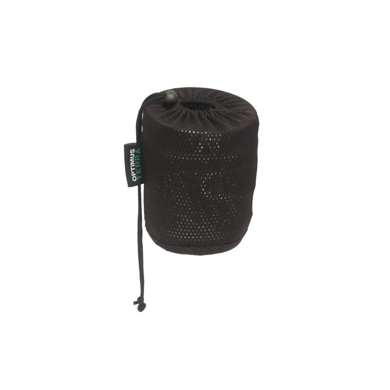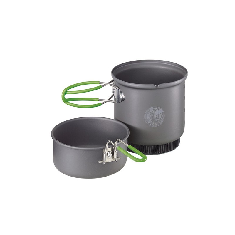 Trail mix for dinner? Not for you! Pair our dependable stoves with the Terra Weekend HE Cook Set to go far beyond nuts and raisins. Made of rugged anodized aluminum like all of their sets, the Terra Weekend HE makes packing it in lighter and cooking it up more fun. Pared back in weight to a mere 275 g, the Terra Weekend HE is Optimus lightest set with two cookware pieces. It includes the impressive, fuel-saving heat exchanger (HE = heat exchanger!) that cuts time to boil by 20%. Stir, fricassee or fry using the pot with pour spout or tough-as-nails fry pan (doubles as a pot lid). A simple mesh carry bag packs it right and tight, magically finding space inside for our titanium cutlery set and any Optimus gas stove too.