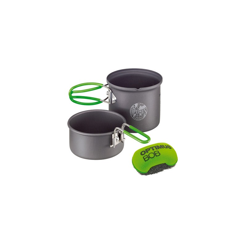 You may go fast, light and solo, but sausages on a stick for dinner arent cutting it. Pair our efficient Optimus stoves with the Terra Solo Cook Set that of course! -- is made of rugged anodized aluminum now also with a non-stick coating. At a mere 209 g, the Terra Solo Cook Set with its two cookware pieces gets a scrummy dinner prepped quickly and on your plate when youre tired and hungry. Or take your time and enjoy the sunset as the stew simmers. You get a pot with pour spot and a tough-as-nails fry pan (doubles as a pot lid). Make your mum proud by keeping it clean with our practical and cute little BOB sponge (included), and keeping it neat in the mesh carry bag. Inside, magically find room to also stash our titanium cutlery set and any Optimus gas stove too.