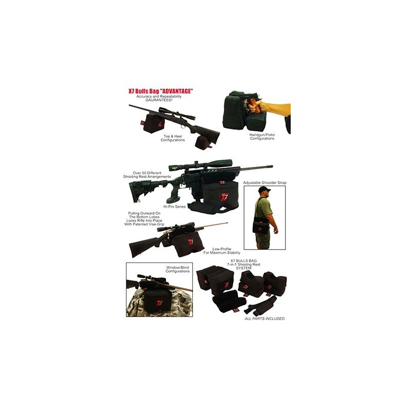 The X-7 Bulls Bag ADVANTAGE shooting rest will transform, as seen in photo, with this one purchase of seven independent bags, to a Hi-Pro and Low-Pro SERIES (Butterfly-BULLS BAG Patented-Grip/Toe & Heel (Owl-Ear Design)/Stackable Bags/ Pistol and Handgun/Adjustable Window and Blind Bag Rifle Rest.