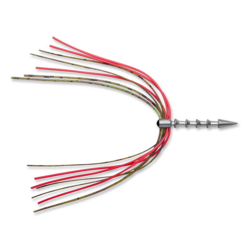 Two-part skirt combining living rubber and silicone material creating a unique action underwater at all temperatures.