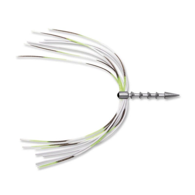 Two-part skirt combining living rubber and silicone material creating a unique action underwater at all temperatures.