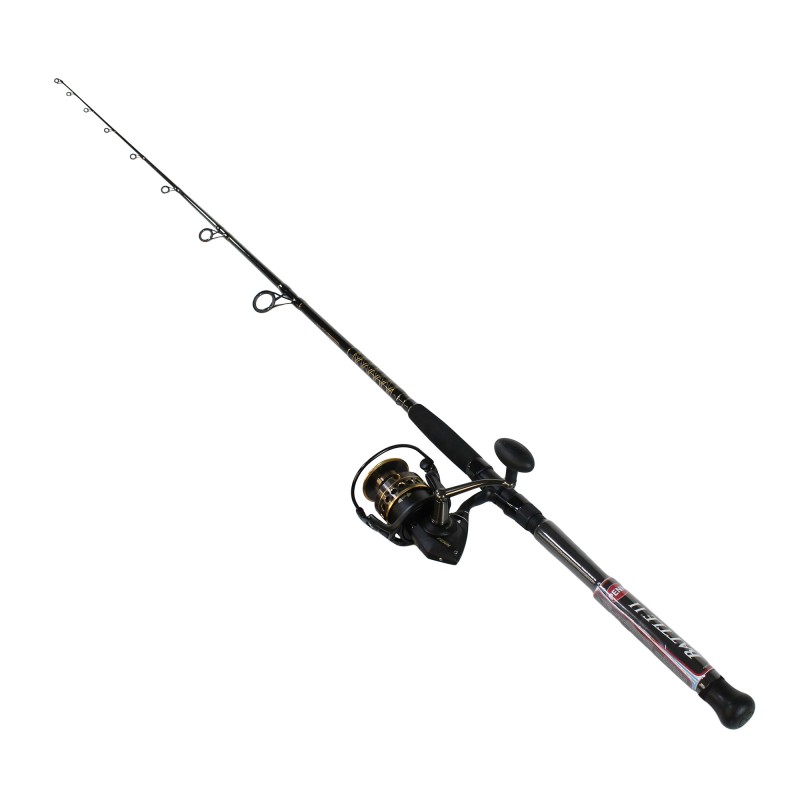 Penn's most popular spinning combo, the Penn Battle II features a Full Metal Body, side plate, and rotor for exceptional durability. The machined and anodized aluminum Superline Spool allows anglers to tie superlines directly to the spool without backing. The HT-100 drag system provides smooth drag under heavy loads. Matched with the graphite composite Battle rod with aluminum oxide guides, no fish stands a chance.