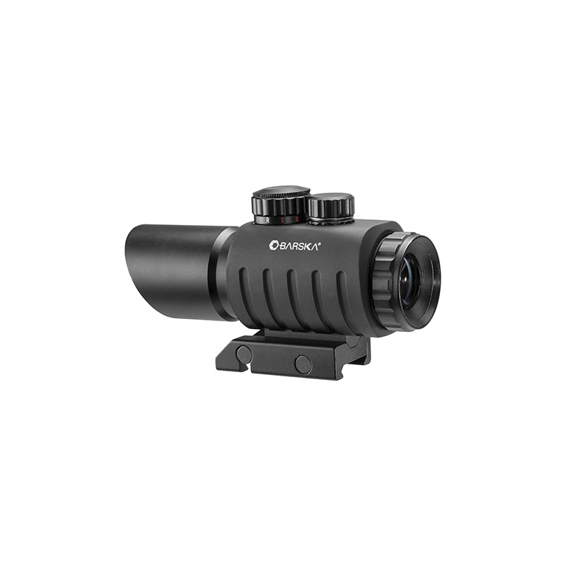 The AR-X 3x30mm Red/Green Prism Scope by Barska features an illuminated Mil-Dot IR reticle patterns, which can be set to five different levels of brightness with the adjustable rheostat. Features a protective rubber armor, flip-up scope caps, and attached retaining cable for the windage and elevation caps. This dot scope is equipped with a standard 5/8 mount that will fit a rifle's standard Picatinny Rails. Powered by included 3V lithium battery.