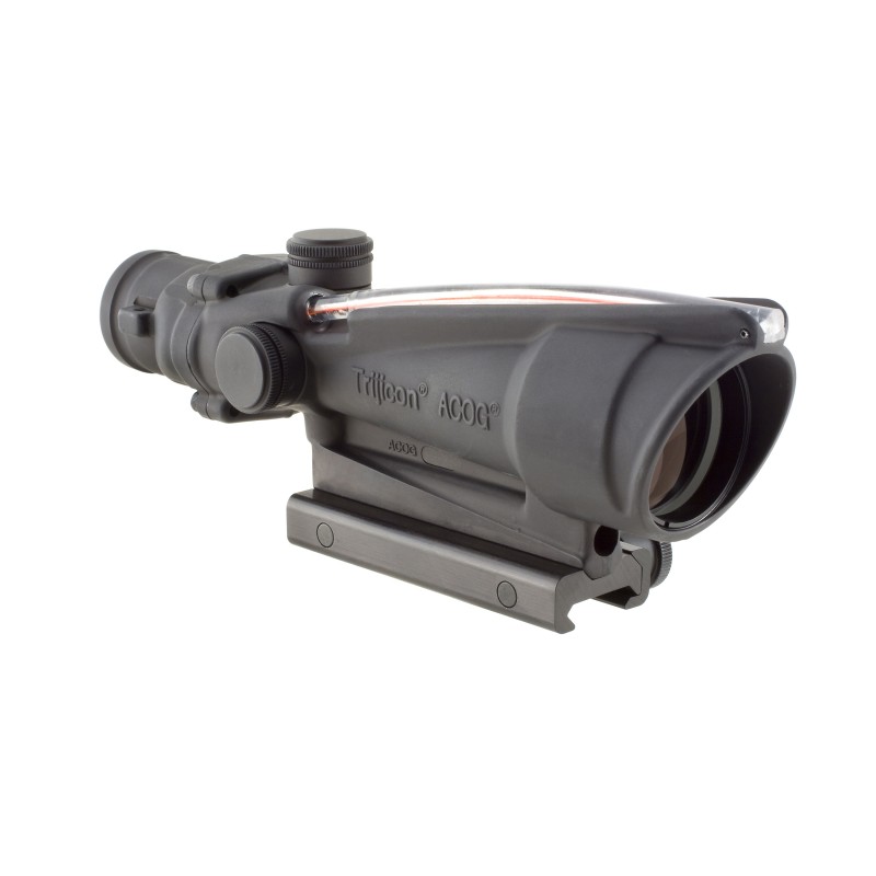 ACOG 3.5x35 scope with Red Chevron BAC Reticle-The ranging reticle is calibrated for 5.56 (.223 cal.) flat-top rifles to 800 meters. Includes Flat Top Adapter. The chevron reticle is designed to be zeroed using the tip at 100 meters. The width of the chevron at the base is 5.53 MOA which is at 19" at 300 meters. This allows range estimation for silhouette targets.