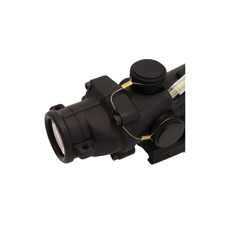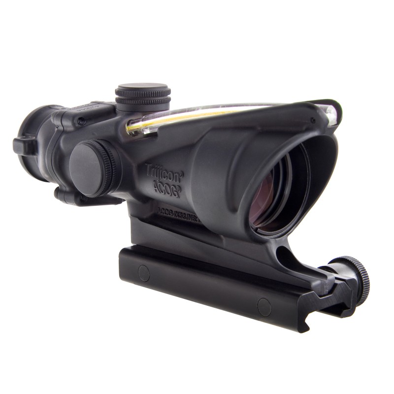 ACOG 4x32 Scope with Amber Chevron BAC Flattop Reticle-includes Flat Top Adapter. The chevron reticle is designed to be zeroed using the tip at 100 meters. The width of the chevron at the base is 5.53 MOA which is 19 in. at 300 meters. This allows range estimation for silhouette targets. Features dual illumination (Fiber optics provides daylight illumination and tritium illuminates reticle at night). The ranging reticle is calibrated for 5.56 (.223 cal.) flattop rifles out to 800 meters.