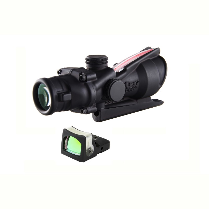 Adapted from the battlefields, US Forces have begun improving this proven Trijicon ACOG scope by adding a red dot sight on top for close encounter missions. Trijicon has now created a similar model for the public, the TA31RM04. The main Trijicon scope provides a dual-illuminated reticle using fiber optics and tritium for bright aiming point in any light condition. The ranging reticle allows for bullet drop compensation out to 800 meters without any manual adjustments. A Trijicon Dual Illuminated RMR sits on top with a 7.0 MOA amber dot.