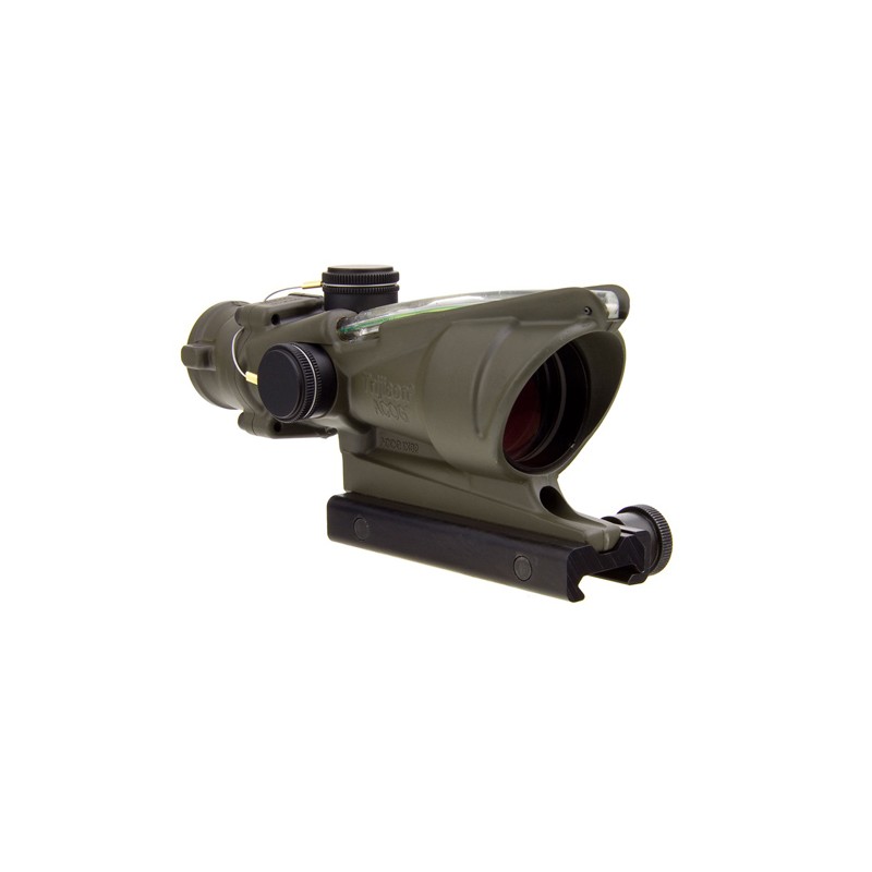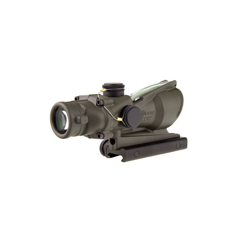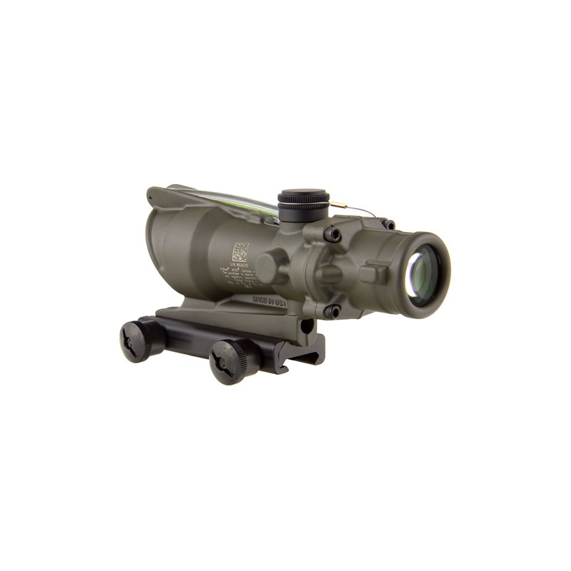 Trijicon ACOG 4x32 Scope with Green Horseshoe BAC Reticle includes Flattop Adapter. Features dual illumination (Fiber optics provides daylight illumination and tritium illuminates reticle at night). The ranging reticle is calibrated for 5.56 (.223 cal.) flattop rifles out to 800 meters.