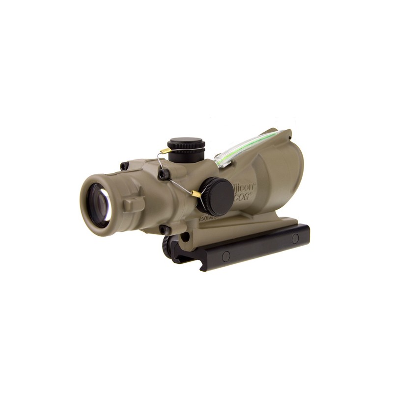 Trijicon ACOG 4x32 Scope with Green Horseshoe BAC Reticle- includes Flattop Adapter. Features dual illumination (Fiber optics provides daylight illumination and tritium illuminates reticle at night). The ranging reticle is calibrated for 5.56 (.223 cal.) flattop rifles out to 800 meters.