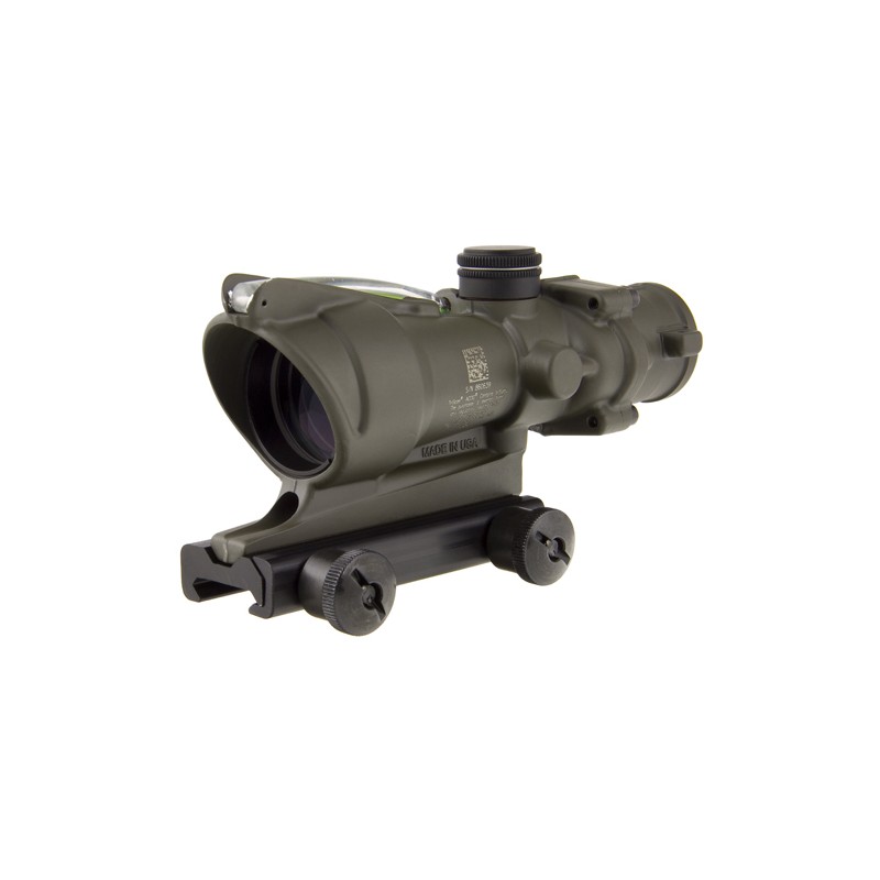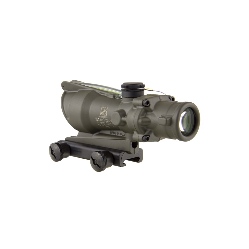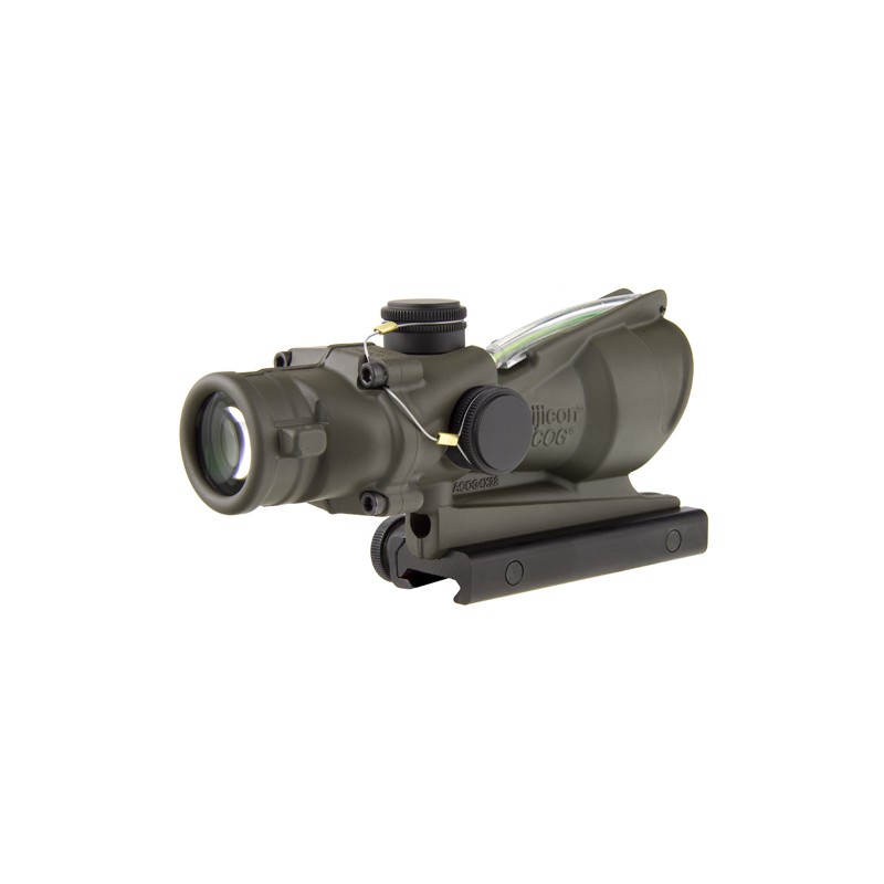 Trijicon 4x32 ACOG scope provides a dual-illuminated reticle using fiber optics and tritium for a bright aiming point in any light condition. The ranging reticle allows for bullet drop compensation out to 600 meters without any manual adjustments.