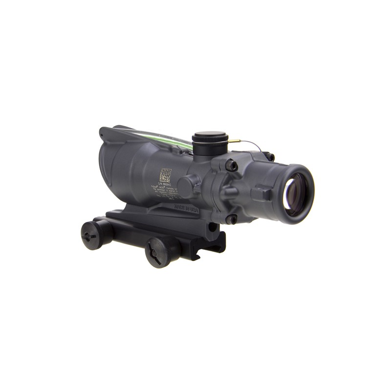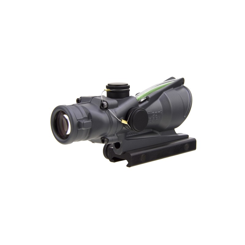 Trijicon 4x32 ACOG scope provides a dual-illuminated reticle using fiber optics and tritium for a bright aiming point in any light condition. The ranging reticle allows for bullet drop compensation out to 600 meters without any manual adjustments.