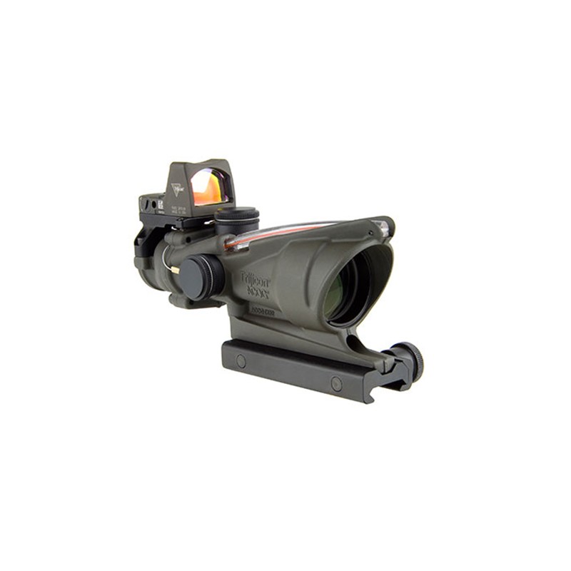 Adapted from the battlefields, US Forces have begun improving this proven Trijicon ACOG scope by adding a small red dot sight on top for close encounter missions. Trijicon has now created a similar model for the public, the TA31-D-100569. The main Trijicon scope provides a dual-illuminated reticle using fiber optics and tritium for bright aiming point in any light condition. The ranging reticle allows for bullet drop compensation out to 800 meters without any manual adjustments. A Trijicon RMR Type 2 sits on top with a 3.25 MOA aiming dot.