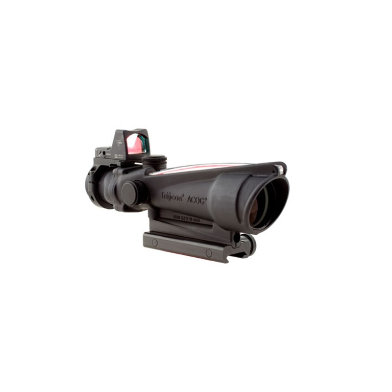 ACOG 3.5x35 scope with Red Crosshair Reticlethe ranging reticle is calibrated for 5.56 (.223 cal) flat-top rifles to 1000 meters. Includes Flat Top Adapter. Daytime illumination is provided by fiber optics and Tritium illuminates the scopes at night. The TA11-D-100557 combines the technology of the 3.5x35 Trijicon ACOG gun sight with the 3.25 MOA Trijicon RMR Type 2 red dot sight. This provides the shooter with the option of quick acquisition close range sighting with the Trijicon RMR Type 2 sight and the precision for longer range shooting with the Trijicon ACOG 3.5x35.