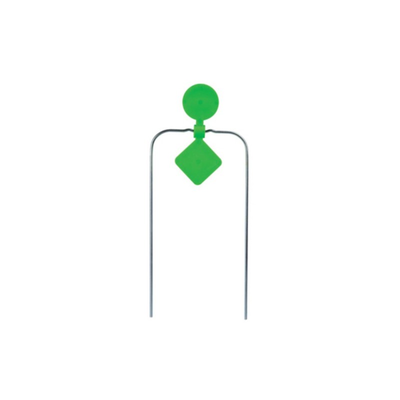 Target is Radiation Green in color for increased visibility. Target consists of an outside target and an inside target. The outside target spins slower than the inside target. Both diamond and circular shapes on outside spinner. Both large and small circle shapes on inside spinner. Three-piece metal frame holds target firmly in place. Designed for 22-cal rimfire, use this for hours of interactive shooting fun.