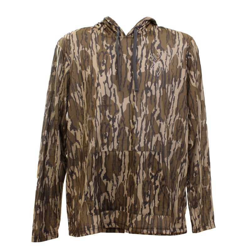 A hoodie for warm weather. Your long sleeve hunting T-shirt just got a little bit better with an attached hood to give you near full camo concealment on the stalk or in a blind. This fully synthetic tee is stretchy, durable, moisture-wicking and anti-microbial.