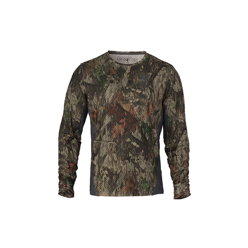 Technical hunting shirts with polyester/mesh fabric hybrid construction, integrated mesh underarm panels, exclusive A-TACS camo patterns.
