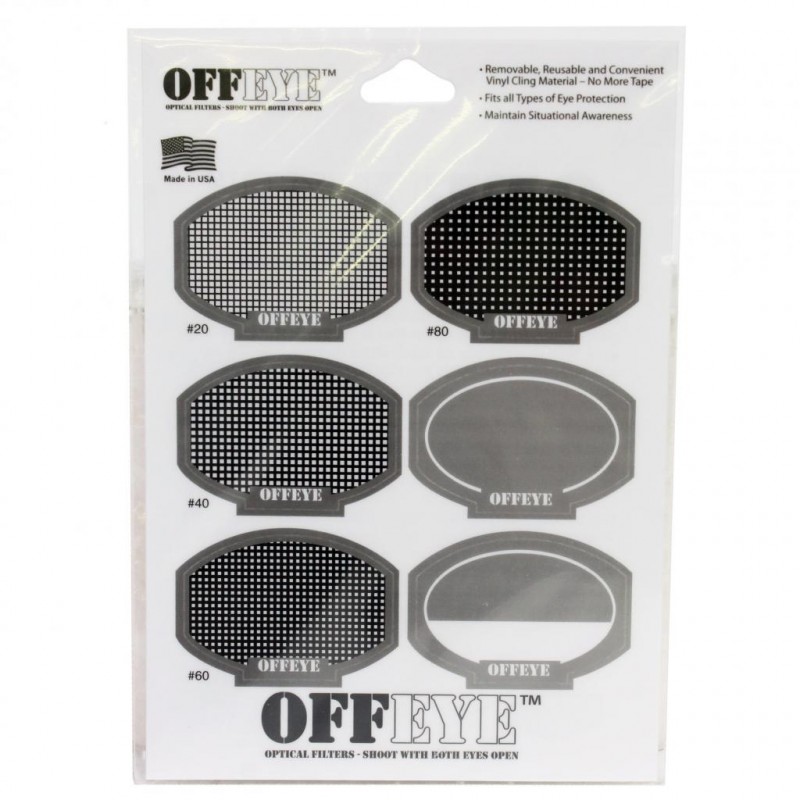 Rarely do advanced shooters shoot with both eyes open. The advantage of both eyes open is 3-D depth preception, field of view and peripheral vision. Binocular vision gives us the ability to pick up on a moving target quicker and react more accurately and efficiently. For shotgun, rifle, handgun and archery. This patented product allows full-time use of a dominant aiming eye and allows the shooter to keep both eyes open. OffEye filters are the first shooting aid designed to not block your vision but to hone the way your eyes perceive the target.