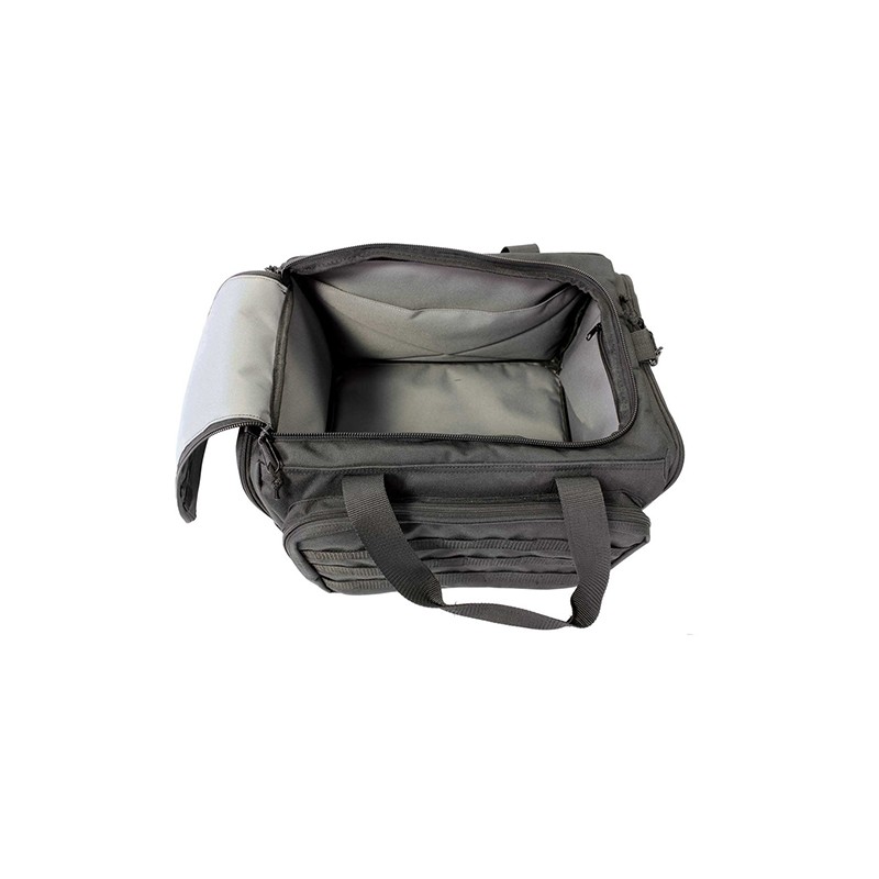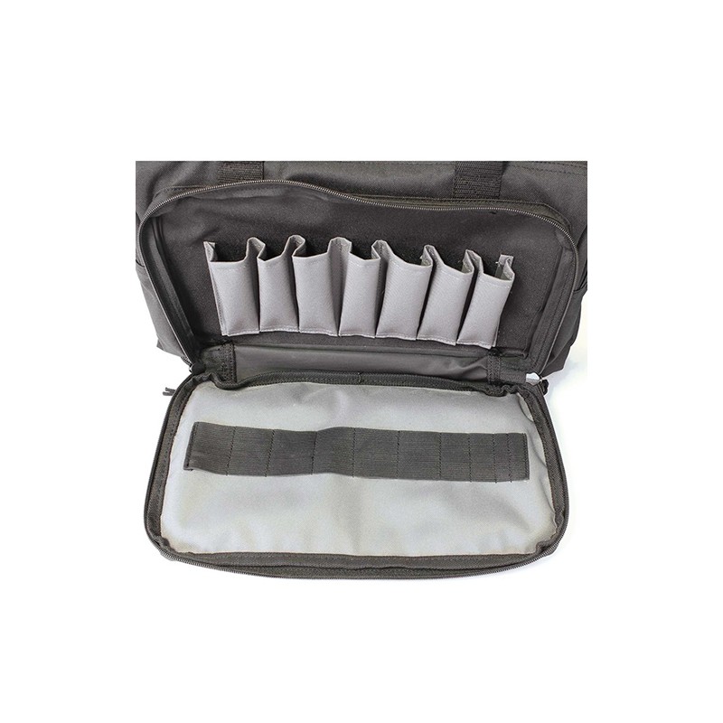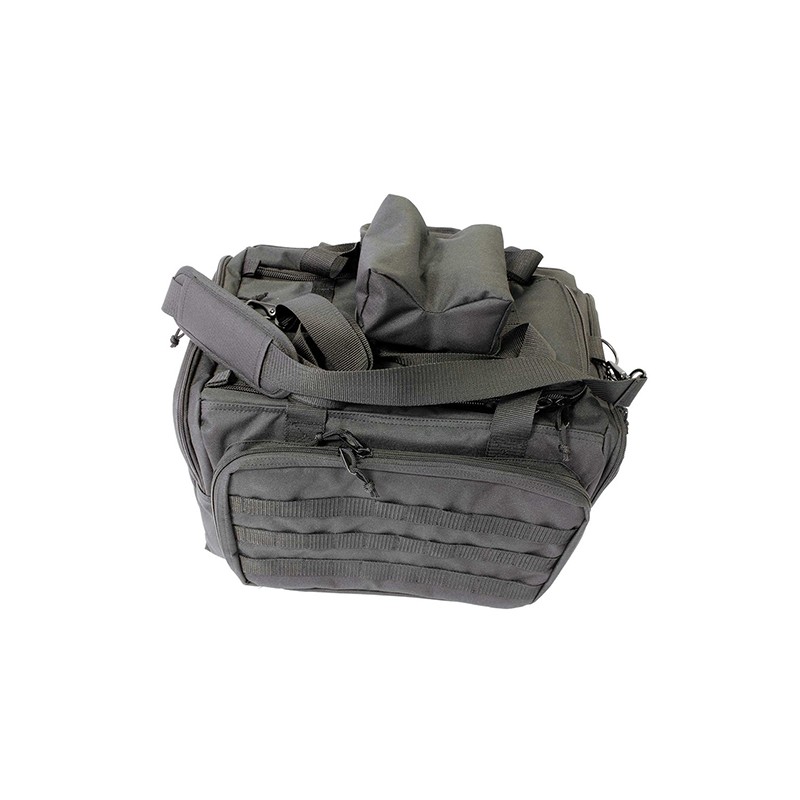 Making it to, and from, the range with all the essentials can be a challenge; until now. The Deluxe Range Bag has the size to carry everything you need at the range as well as the features to make hauling gear, and shooting, more enjoyable. The attached, adjustable shooting rest makes high volume days on the range more productive and comfortable while the light grey interior makes finding small, or dark colored equipment a snap. The Deluxe Range Bag also features, a zippered target pocket, segmented accessory pocket, and an abundance of MOLLE webbing.