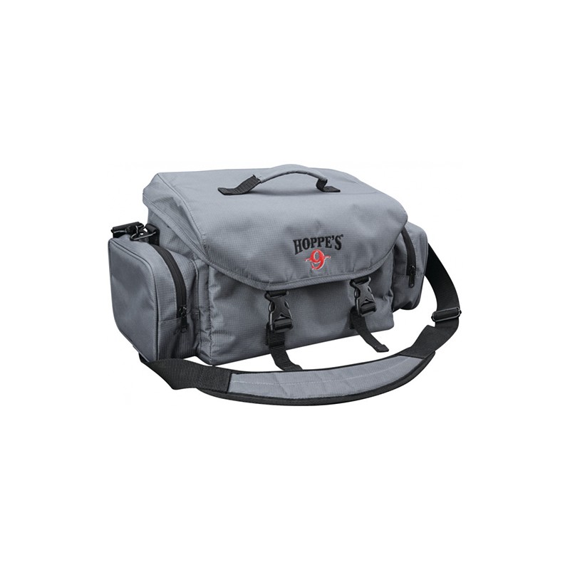 A trip to the range includes firearms, ammunition, targets, firearm cleaning supplies and safety equipment. Its a lot of gear to organize and Hoppes Range Bags can hold it all. The bags come in three sizes, and include a handgun strap for safe and secure firearm transport. Each bag has multiple pockets for storing every necessity and accessory. Theyre made from sturdy 600 Denier Ripstop polyester, a material that resists cuts and tears. When its time to go shooting, Hoppes Range Bags will be ready to go, time after time.