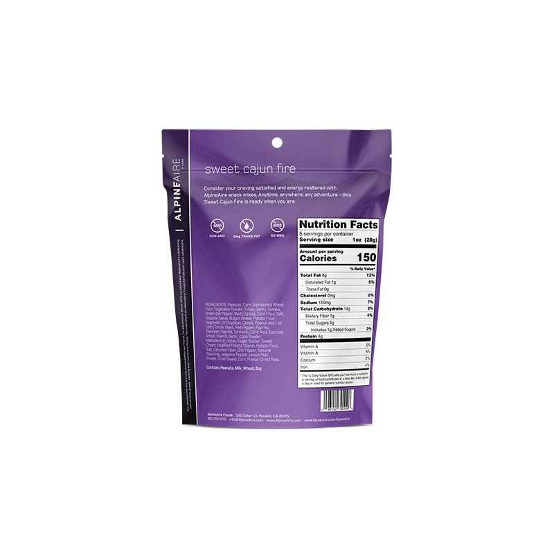 Utilizing natural ingredients to provide on-the go fuel for long days on the trail, Alpine Aire Sweet Cajun Fire Mix includes seasoned peanuts, sweet corn, honey roasted and Cajun sesame sticks. The mix comes in a 5 ounce serving.