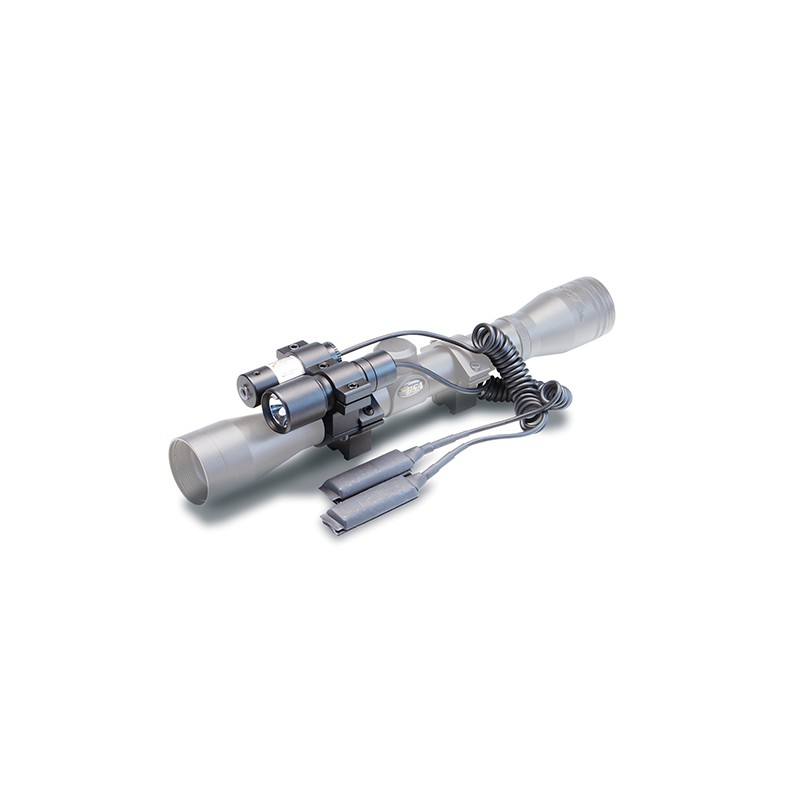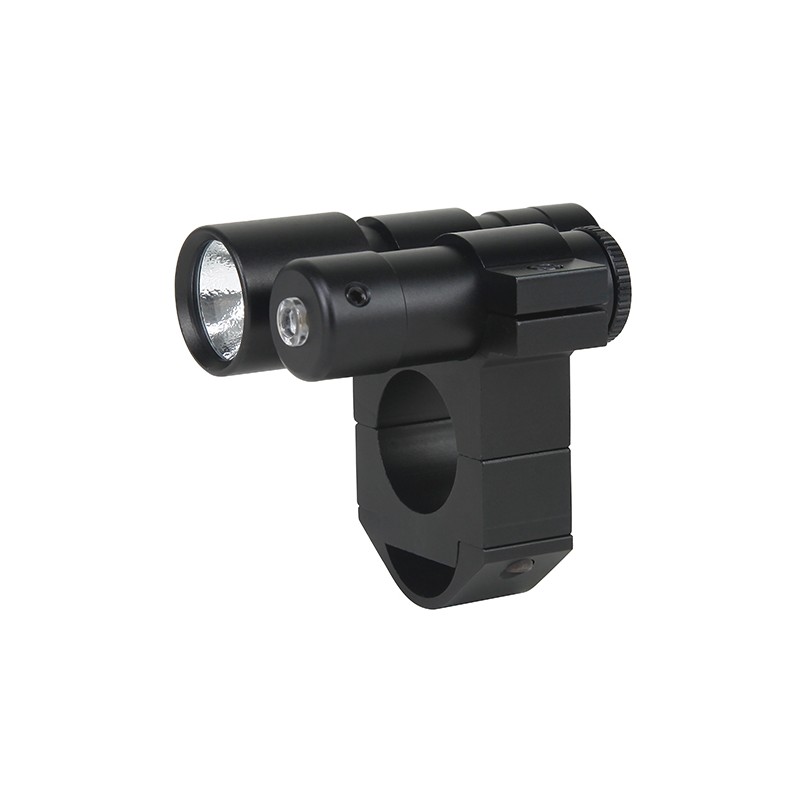 This combination clamps to any 1" scope tube, illuminating the target with both a Xenon white light and a bright red laser. Recommended for rimfire rifles and airguns only. Includes scope ring, 3 button cell batteries for laser, one 3 volt lithium battery for the light. Covered by a 1 year warranty.