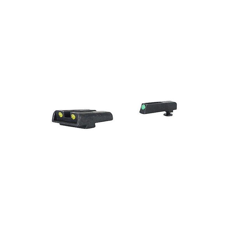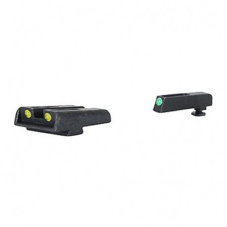 TruGlo Fiber Optic Sight Set Glock 17, 17L, 19, 22, 23, 24, 26, 27, 33, 34, 35, 38, 39 Steel Tritium / Fiber Optic Green Front, Yellow Rear. Sight is bright and visible regardless of the lighting conditions. Fiber optics capture and amplify any available light, while a tritium vial provides illumination during complete darkness. Steel construction. Rear sight is adjustable for windage. Three dot sight system with high visibility green front dot, and yellow rear dots.