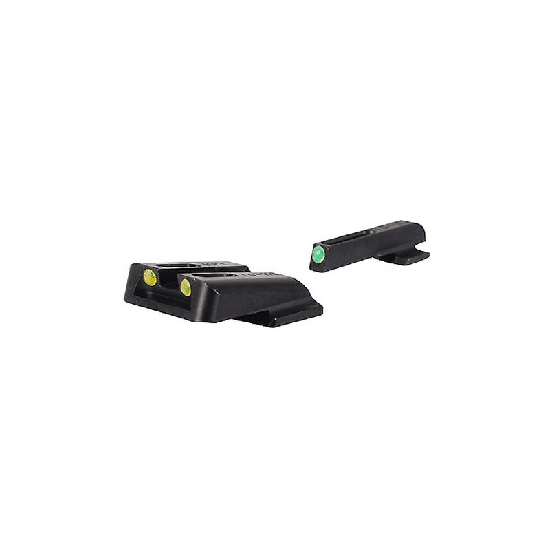 TruGlo Fiber Optic Sight Set S&W M&P, SD9, SD40 Steel Tritium / Fiber Optic Green Front, Yellow Rear. Sight is bright and visible regardless of the lighting conditions. Fiber optics capture and amplify any available light, while a tritium vial provides illumination during complete darkness. Steel construction. Rear sight is adjustable for windage. Three dot sight system with high visibility dots.