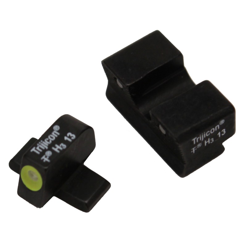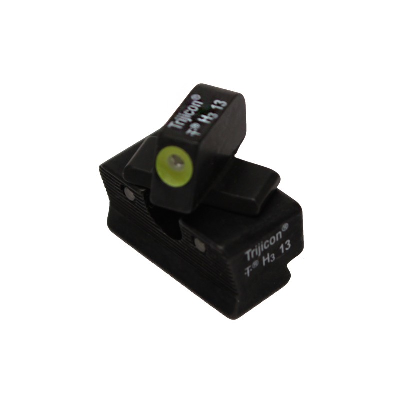 The three dot green tritium night sight set's front sight features a taller blade and an aiming point ringed in photoluminescent paint (Yellow) while the rear sight is outlined in black and features a wider U-shaped notch. This unique configuration increases visibility and quickens front sight acquisition - even in transitional lighting.