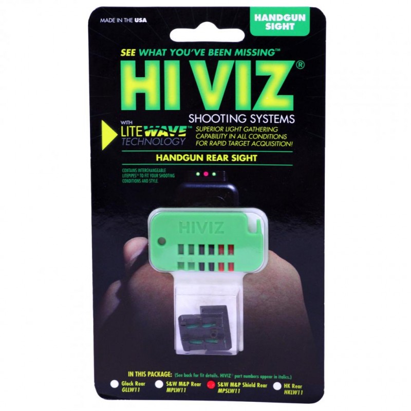 HiViz Smith and Wesson MandP Shield LITEWAVE Interchangeable rear sight. Fits MandP Shield in 9mm and .40 Smith & Wesson caliber. Includes Lite Pipes and key to change Lite Pipes. The LITEWAVE sight design from HiViz features an innovative, diagonal-wave design that increases durability to the protective exoskeleton and allows for more exposed surface area for the LITEPIPE to gather light from all angles, for the brightest sight available.