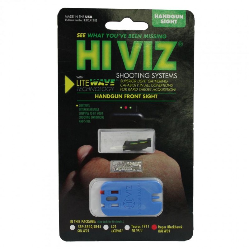 HiViz Ruger Interchangeable LITEWAVE front sight - Skeletonized sight body. Fits Super Blackhawk Hunter, Red fiber optic family Lite Pipe Hawk and Super Red fiber optic family LitePipehawk with spring plunger retained front sight. Includes three Lite Pipes in Red fiber optic family Lite Pipe, green and white and key to change Lite Pipes. The new LITEWAVE sight design from HiViz features an innovative, diagonal-wave design that increases durability to the protective exoskeleton and allows for more exposed surface area for the LITEPIPE to gather light from all angles, for the brightest sight available.