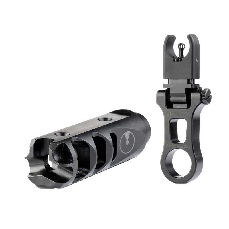 The Ultradyne C4 Muzzle Device Combo includes both Mercury Muzzle Brake and Dynamount Flip-Up Front Sight. The Ultradyne Mercury has been meticulously engineered to provide superior recoil reduction and neutralize muzzle rise with a smooth, balanced release of blast energy. Progressive 90° side ports vent combusting gases at intervals that spread out the recoil impulse for efficient, accurate follow-up shots. The Mercury Compensator is light-weight and includes wire-cutter design on the front.