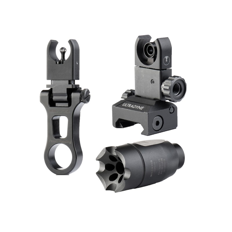 The Ultradyne C4 Sight System Combo includes the Dynamount Flip-Up Front Sight, Flip-Up Rear Sight and Athena Linear Compensator. The Ultradyne C4 Flip-Up Rear Sight utilizes Ultradyne's exclusive dynalign sight picture technology for accurate and immediate acquisition. Most BUIS systems utilize a sight picture that is non-intuitive. In such systems, the brain's visual systems are asked to align a circular rear aperture with a rectangular front post shape while simultaneously ignoring the 'ears' that protect the front sight post. Dynalign's circle-within-circle sight picture allows for faster sight picture acquisition. Additionally, the use of a front aperture further reduces parallax effect which makes accuracy less depend on precise sight alignment. Dynalign is a faster and more accurate sight picture than can improve shooting performance.