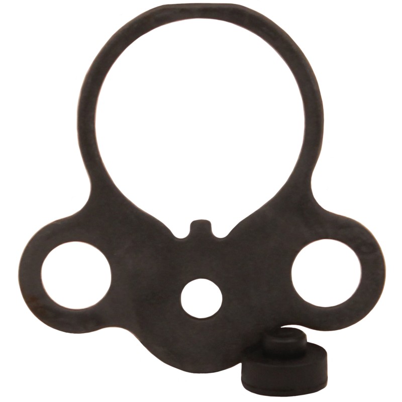 The ambidextrous single point sling attachment plate replaces the collapsible (4 or 6) position butt stock retaining plate. The sling attachment plate allows the use of a single point sling to be attached to the plate. The plate allows the weapon to be worn on both the right and left side. Constructed of black oxide carbon steel.