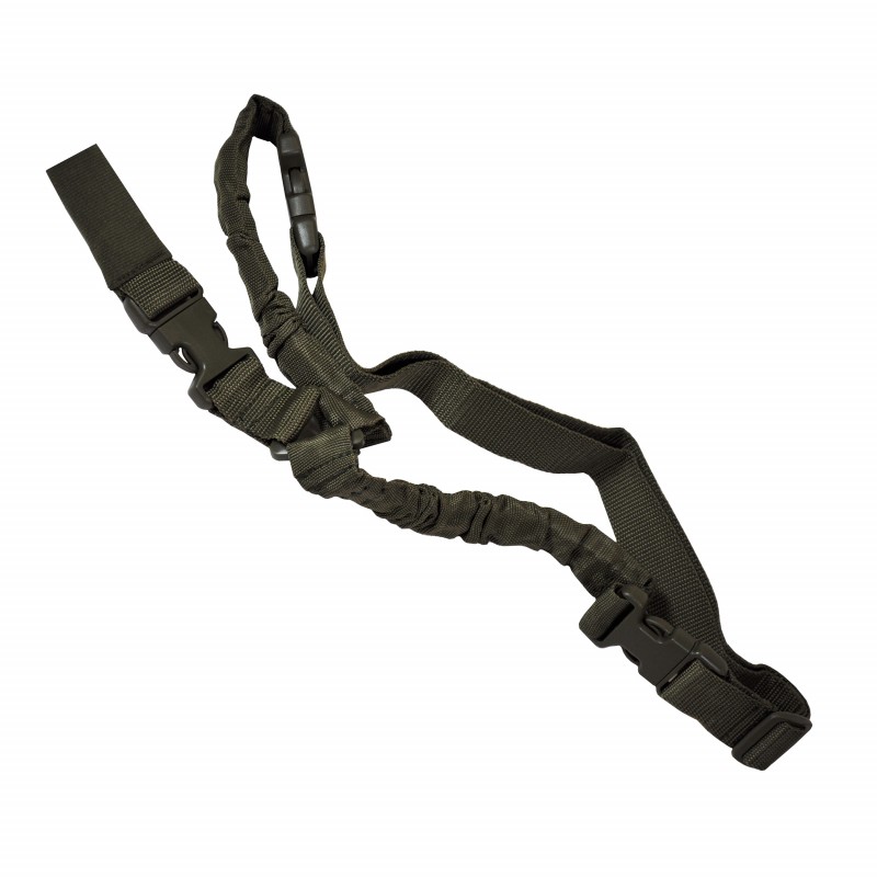 - Adjustable deluxe single point bungee sling featuring three quick connect buckles and a metal spring clip
