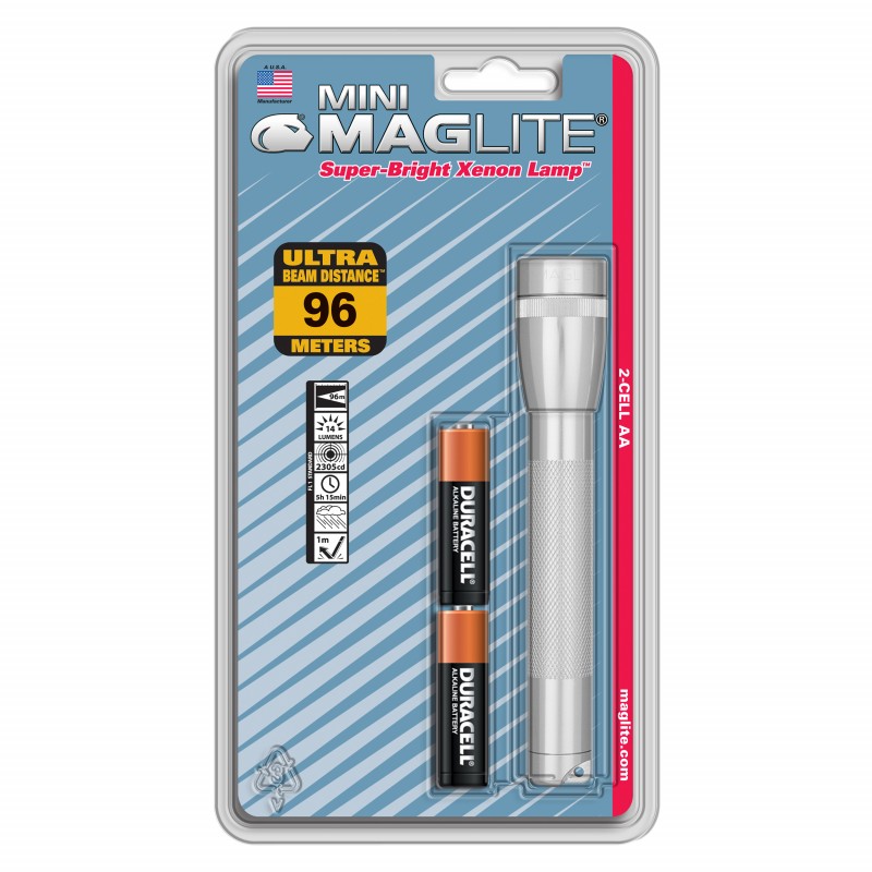 Made with the finest aircraft aluminum, the Mag AA Mini-Mag Flashlight possesses an exceptionally durable body that is machined to exacting tolerances. A set of O rings at each opening ensure a Maglite is resistant to water and steadfast in its ability to withstand shock. The light has an anodized finish inside and offers optimum corrosion resistance and prevents battery damage, and a knurled handle for a better grip. The Mag Instrument AA Mini Mag has a candle mode feature for convenient hands free light whenever you need it. The fast focus beam adjusts from spot to flood with the turn of the head. The self-cleaning switch eliminates oxidation. The Mini Mag light comes with batteries, and extra bulb in the tail cap. Mini Maglite AA flashlight is available as a package containing batteries and a rugged polypropylene belt holster. Mini Maglite AA combo pack flashlight is available as a package containing batteries a rubber anti-roll device, pocket clip, wrist lanyard and batteries.