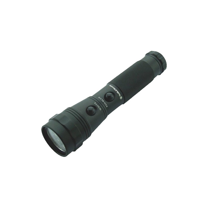 The Galaxy Series 1222 LED Flashlight with 6 White LEDs, 2 Red LEDs, 2 Blue LEDs, 2 Green LEDs is Constructed from Anodized Aircraft Aluminum in Matte Black; Shatterproof, Scratch-Resistant Polymer Lens with Anti-Reflective Coating; 6 White LEDs; 2 Red LEDs; 2 Green LEDs; 2 Blue LEDs; Double "O" Ring Sealed for Waterproofing and Extreme Weather and Corrosion Resistance; Nylon Holster with Duty-Belt Sized Opening and Velcro Loop Attachment with Spare Battery Compartment.