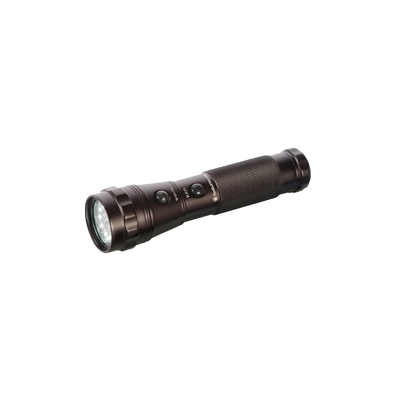 The Galaxy Series 13 LED Flashlight is Constructed from Anodized Aircraft Aluminum in Matte Black; Shatterproof, Scratch-Resistant Polymer Lens with Anti-Reflective Coating; 10 White LEDs; 3 Red LEDs; Double "O" Ring Sealed for Water Proofing, Extreme Weather and Corrosion Resistance; Nylon Holster with Duty-Belt Sized Opening and Velcro Loop Attachment with Spare Battery Compartment.