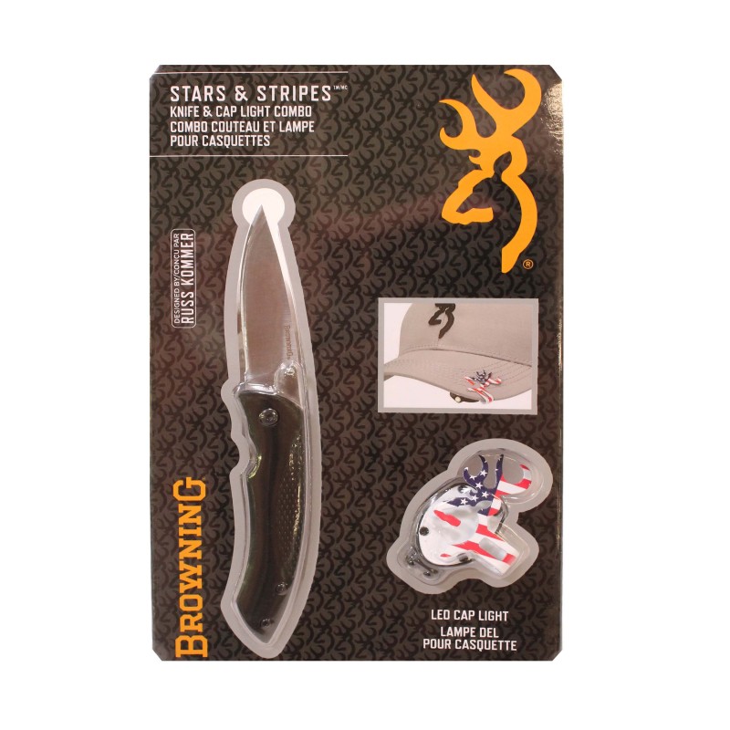 You'll be ready for your next camping or hunting trip with the Browning Stars and Stripes Knife and Light Combo. The folding liner-lock knife features a strong, sharp stainless-steel blade and an aluminum handle, and the stars and stripes Buckmark cap light features white LEDs for everyday use and green LEDs for nighttime visibility. 2" blade length. 6" overall length.