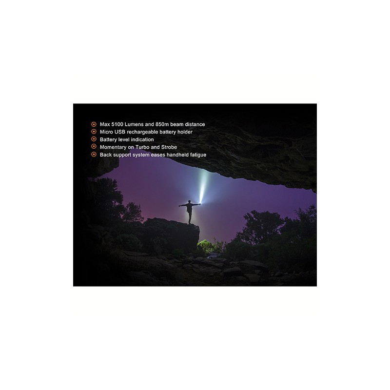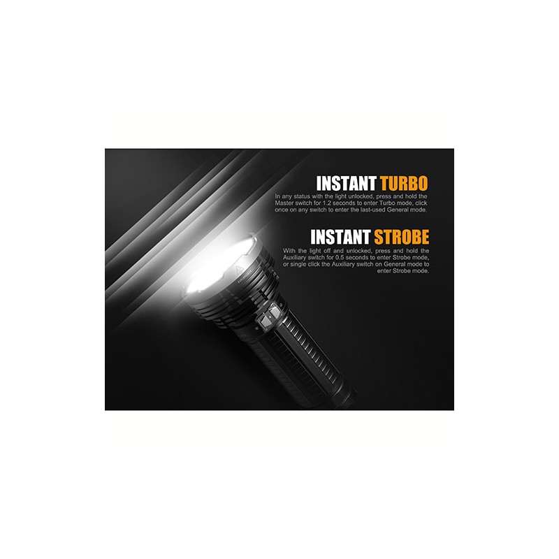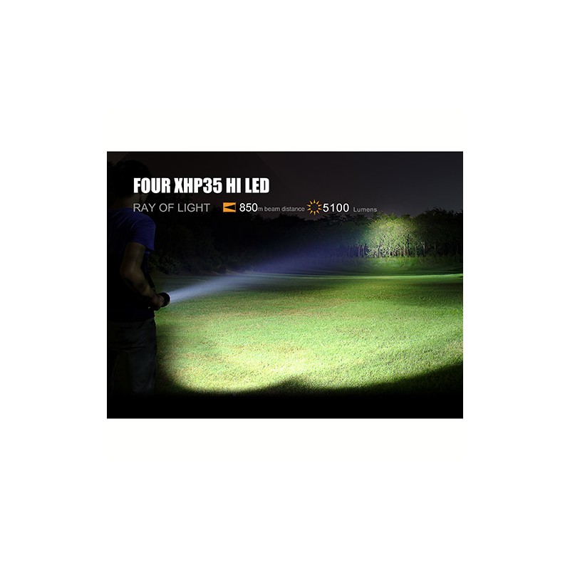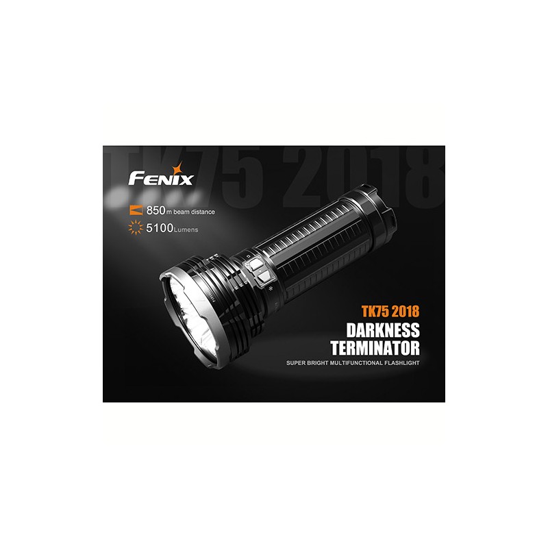 The Fenix TK75 2018 Edition, is a rechargeable flashlight with an astonishing combination of 5100 Lumens maximum output and 2,788.71 feet/850m maximum distance. The innovative rechargeable battery holder comes with a Micro USB port, and the Fenix TK75 is powered by four 18650 batteries. Fitted with 4 Cree XHP35 HI LED, the TK75 2018 flashlight goes the distance in power and versatility to satisfy various lighting demands like searching, securing, caving and more. The dual stainless steel switches offer user-friendly output selection of 6 brightness levels and 2 flash modes of instant turbo and strobe. The lockout function prevents the possibility of unintended operation of the flashlight. Additionally, a built-in socket that can take either a shoulder strap or tripod mount for carrying or mounting, makes the Fenix TK75 even more advantageous and reliable in searching, securing, caving and as standby lighting for cars.
