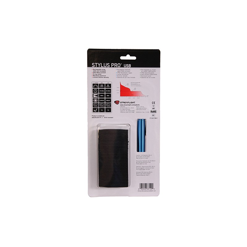 A sleek, compact, USB rechargeable pen light Allows you the flexibility of charging on-the-go using the included USB cord or optional AC wall adaptor Removable pocket clip Push-button tail switch Nylon Holster Durable, anodized machined aircraft aluminum construction Rechargeable lithium-ion battery Sliding metal sleeve protects USB port Recharge by plugging into USB port or optional AC wall adapter C4 LED produces 70 Lumens, 630 candela, and runs 3.5 hours Lithium-ion battery recharges in 2.5 hours and is rechargeable up to 30 times Charge indicator: lights red when charging and lights green when fully charged Fully regulated output for consistent lumen performance over the battery life Gasket-sealed glass lens IPX4 water-resistant 1 meter impact-resistance tested 6.15 and 1.9 oz. with battery