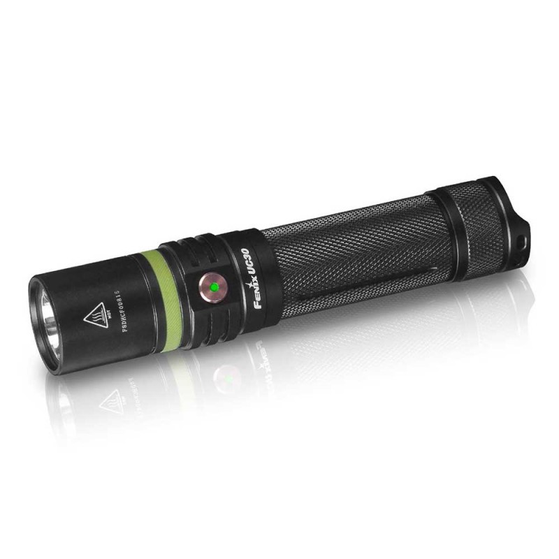 The Fenix UC30 LED Flashlight 2017 Edition includes a bump to 1000 lumens and a maximum runtime of 150 hours. The Fenix UC30 is fitted with a Cree XP-L HI V3 LED that will throw the 1000 lumens an incredible 830'. The Fenix UC30 LED flashlight runs off a single 18650 battery or another option would be two non-rechargeable CR123A's. This everyday carry flashlight features a green rubber boot that is luminous as well as a battery status indicator located on the stainless steel side switch. This rechargeable flashlight is even includes a lockout function making the Fenix UC30 a must-have for your EDC collection.