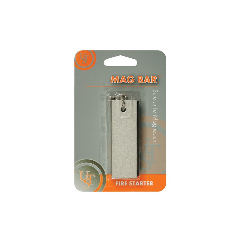 Tried and true, the UST MagBar Fire Starter combines magnesium shavings and the sparks of a flint to start a fire when you need it. Use the serrated edge to shave off magnesium into a pile, then use the other edge to strike the flint bar and create sparks to reliably start hundreds of fires.