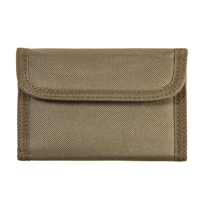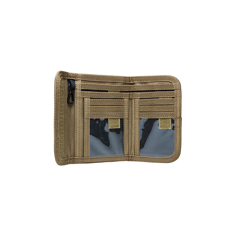 - Tan bifold wallet with several ID & credit/membership card pockets inside and out. The wallet has a hook and loop fastener enclosure flap.