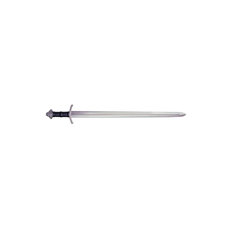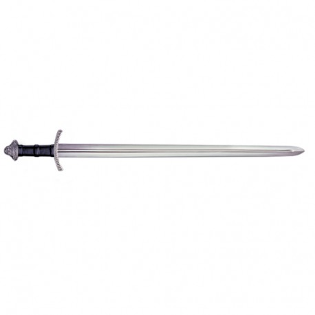 This sword has features in common with its historical counterpart. It has a double edged blade, hand forged out of high carbon steel and then polished to a brilliant lustre. The wooden handle is covered in leather and is supported by a simple, elegant guard at one end and an equally handsome 5 lobed pommel at the other. Both guard and pommel feature traditional Celtic knot embellishments.