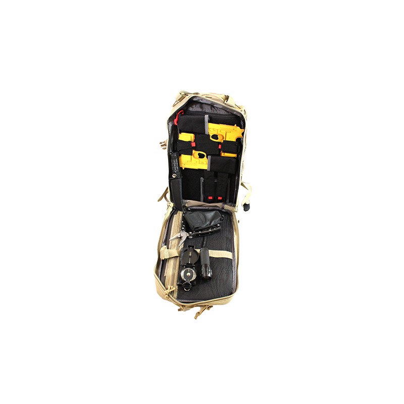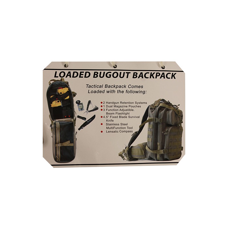 Store all your essential readiness gear in one pack. Two locking compartments to store your firearms and other valuable essentials. Loaded with the following: two handgun retention systems; one dual magazine pouch; 3-function adjustable beam flashlight; 4.5 inch fixed blade survival knife; stainless steel multi-function tool; lensatic compass. Equipped with specialized velour-lined pockets for shooting glasses and ear pieces. Removable tactical logo patch. MOLLE webbing system. Visual ID storage system for quick access of gear. Padded shoulder straps.