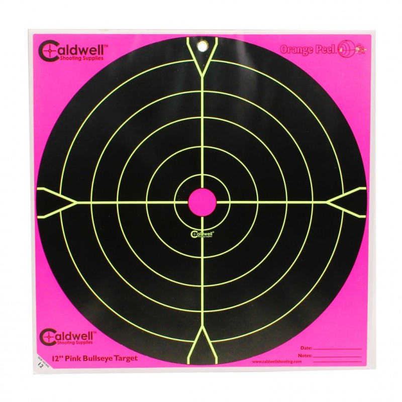 Caldwell Orange Peel Targets consist of a black bullseye on a bright pink background. A hit on the bullseye is rewarded with a bright green ring that is easily seen at a distance. A miss on the pink border leaves a bright white ring. Either way, the target is easily scored without leaving the firing line. Each target also features a convenient self-adhesive backing.