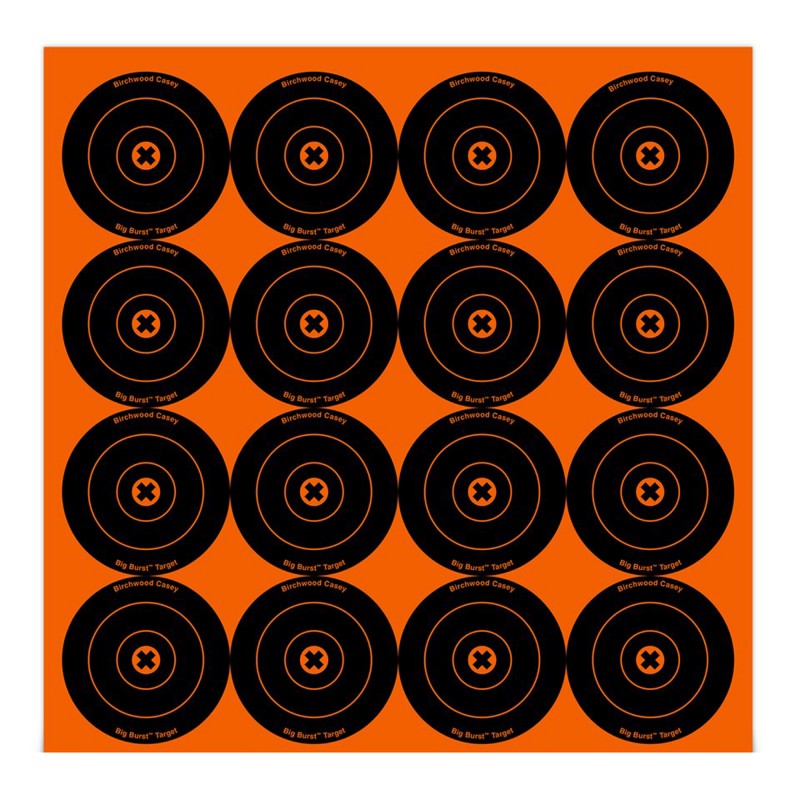 Birchwood Casey's latest innovation in revealing targets. Shoot from any distance and Big Burst Revealing Targets instantly reveal your bullet holes in a high-visibility white burst! See your bullet holes appear immediately and enjoy a more fun shooting experience and more productive practice. Big Burst reveals results on the entire target, from border to border - every shot that hits bursts into white! No more need for binoculars or spotting scopes-you'll see the color burst easily at a distance. Maximum contrast orange and black colors provide maximum visibility! Self-adhesive for quick and easy set up.