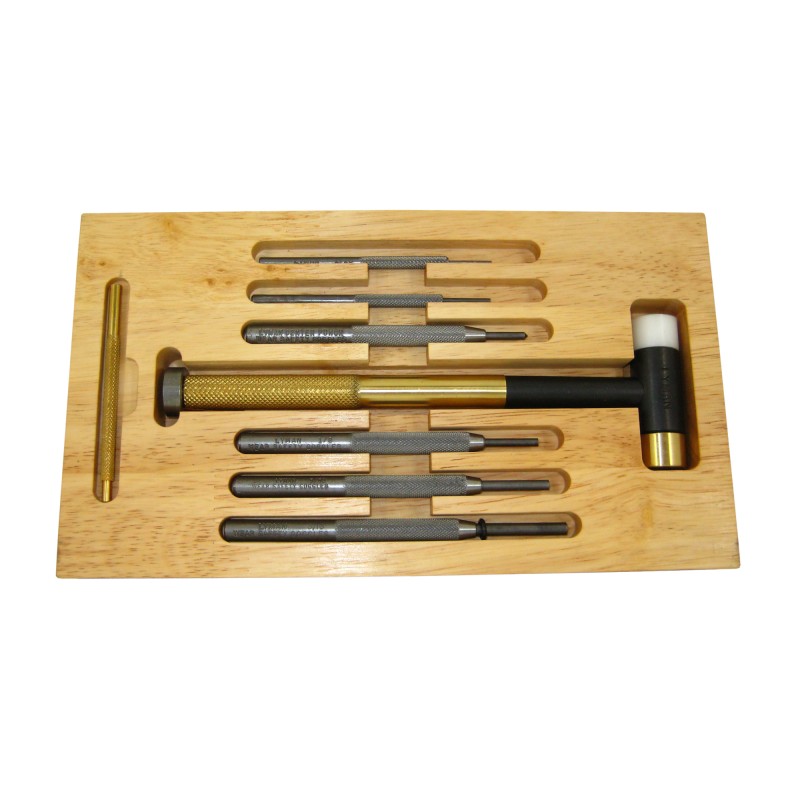 The ideal combination for the home gunsmith or handyman. Each set features a complete selection of quality Gunsmith Punches plus the popular Brass Tapper Hammer. This unique set comes in a custom hardwood storage case which separates each punch by size for quick access.