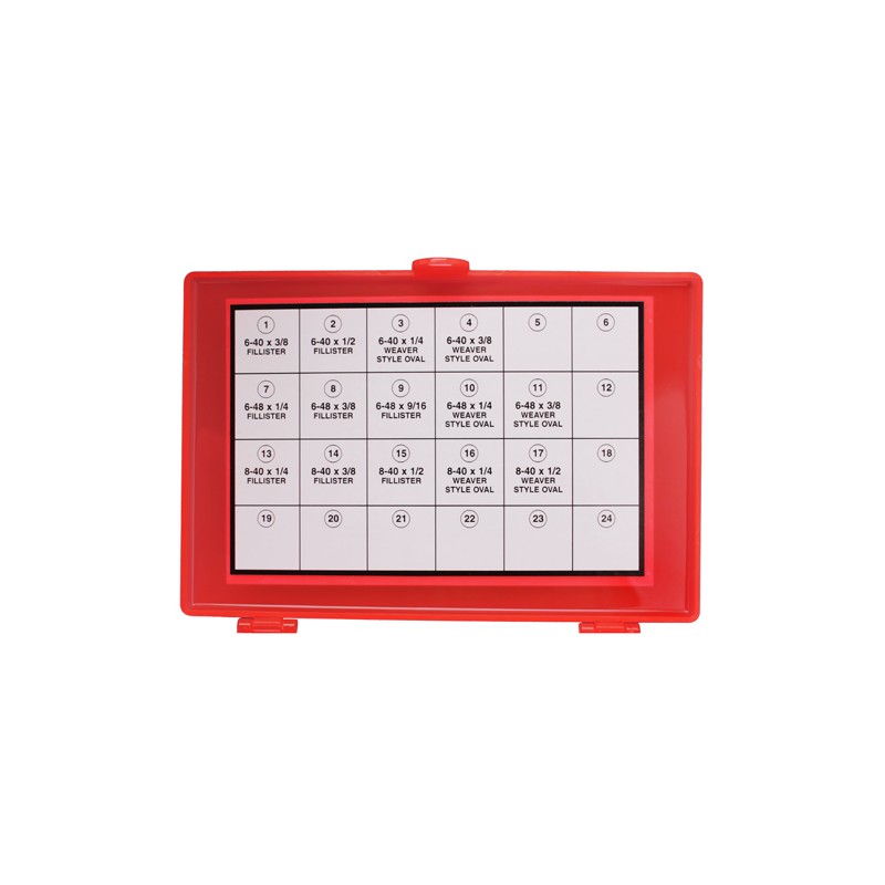 These difficult to find screws are favored non-slip replacements for slotted screws. Packaged in a handy storage box with individual compartments for each size screw. Includes tweezers and a thread size gauge, which also doubles as a shortening jig used to grind a screw to a shorter length.