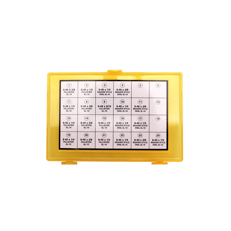 These difficult to find screws are favored for their non-slip design. Packaged in a handy storage box with individual compartments for each size screw. Includes tweezers and a thread size gauge, which also doubles as a shortening jig used to grind a screw to a shorter length.