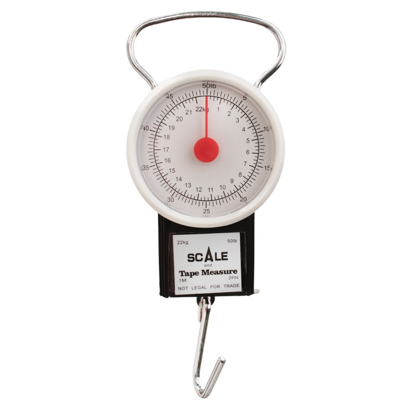 Eagle Claw 50 lb. deluxe, easy-to-read Dial Scale comes complete with chrome handle and hook for easy fish attachment. Included 39" tape measure lets you scale up its length, as well.